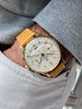 Other: It's no secret that we love a great vintage chronograph watch (especially in gold) and this beautiful Angelus Chronodato is no exception... This particular model was extremely innovative and way ahead of its time in terms of design, size, and movement construction. It is in top condition and has some incredible wrist presence at 38mm. The jumbo case is sharp and unpolished. The in-house Angelus 217 movement features quick-set calendar functions and silky-smooth chronograph activation thanks to a high-grade column-wheel design. The handmade calfskin strap pairing is quite striking if we may say so. As an added bonus, our watchmaker just completely overhauled the movement with a fresh domed acrylic crystal installed at the time of service.