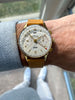 Features: Stunning original white dial with triple-calendar display; original gold-tone handset; in-house Angelus 217 two-register chronograph movement with 45-minute recording capability and quick-set date functions; unpolished jumbo 38mm gold-plated case with domed acrylic crystal; collector-grade condition; new 18mm handmade strap
