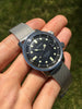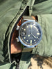 The iconic Benrus Ultra-Deep sports a minimalist matte black dial with luminous hour plots and a uniquely-shaped luminous handset that includes a cool "spear" sweeping-seconds hand. We love the vintage look of the tall domed acrylic crystal with internal date magnifier. The classic Brevet Super-Compressor case with oversized crowns sits just right on the wrist and was originally rated to an impressive 666 feet. The retro-style mesh bracelet completes an overall sporty look that is versatile and perfect for sunny weather.