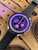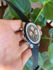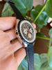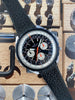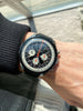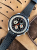 Features: Stunning original glossy black dial with contrasting off-white sub-registers; original handset with neon orange chronograph register hands; unpolished 48mm stainless steel case with original domed acrylic crystal and rotating slide rule bezel; Venus 178 manual-winding movement with column-wheel activation and 12-hour chronograph recording capability; NOS vintage strap
