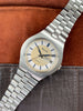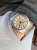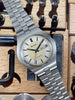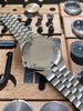 Other: Looking for a unique vintage watch without breaking the bank? Consider this really cool 1973 Bulova Clipper "AT" Day-Date Automatic. The unpolished 37.5mm steel case with integrated bracelet design sets this watch apart from the rest. We love the silver and white sector dial with dark blue accents and matching hour/minute hands. This particular example is in very honest original condition and comes with a little bit of extra history. It was presented to Gerald Jones for 26 years of loyal service to Ossit Church Furniture Company. The company was originally founded in Milwaukee, Wisconsin in 1867 and eventually moved to nearby Janesville in 1935 before closing its doors in 1983. As an added benefit, the movement was just overhauled by our watchmaker and is ready to wear and enjoy!