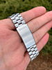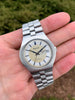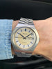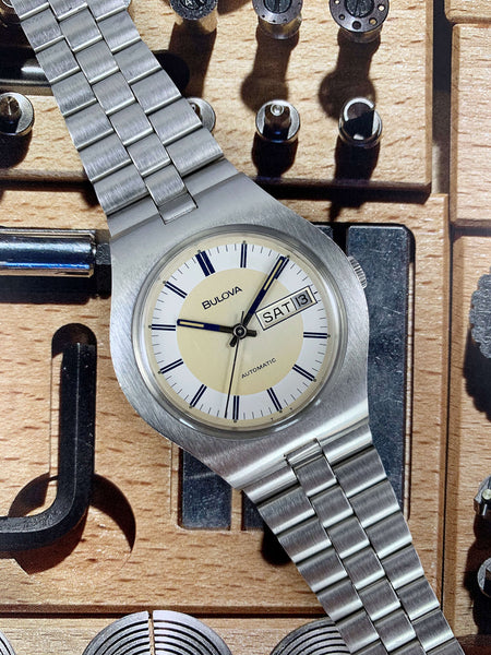 Features: Stunning original silver and white sector dial with contrasting dark blue accents; day-date display at 3 o'clock; quick-set date via repeated pulling of the crown; original luminous hands with matching dark blue tips; original center sweeping-seconds hand; 37.5mm unpolished stainless steel case with original Bulova domed acrylic crystal and integrated bracelet; cool caseback inscription