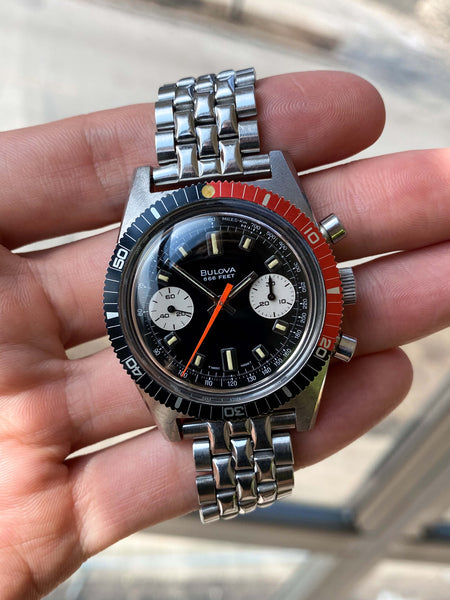 Other: The Deep Sea Chronograph "B" is our favorite execution of all the Bulova 666 Feet Devil Diver lineup. When we discovered this top-quality example, it was on this killer period-correct JB Champion bracelet! It is nearly impossible to find this reference in this type of condition... It's also quite rare to see the mirror glossy black dial with no peeling around the hour markers. Even the "Coke" dive bezel is bright and vibrant, which is indicative of this watch sitting in a drawer for most of its life. And the original domed crystal is very clean. As an added bonus, the Bulova 14EB (Valjoux 7733) movement has been completely overhauled by our watchmaker with new gaskets installed at the time of service.