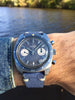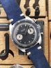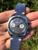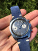 Features: Stunning original matte blue dial with white sub-registers and very attractive yellow Tritium lume plots; original handset with matching yellow Tritium lume; 30-minute chronograph recording capability; original rotating blue "ghost" bezel with countdown feature; oversized stainless steel case with original acrylic "super-dome" crystal