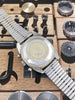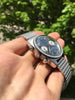 There are several distinguishing characteristics of the earliest examples with the most obvious being the "M9" date stamp on the caseback. The initial dials did not say "666 FEET" and Bulova would add that in 1970 to advertise the impressive depth rating of these watches. Interestingly enough, Bulova chose to proudly embrace the 666 feet rating, hence the Devil Diver moniker. The earliest hands featured shorter luminous inserts. Later hands would come with longer luminous inserts for improved legibility in low light. Early examples also feature skinny, elongated numerals on the rotating bezel. We will refer to this as a MK1 bezel. Later MK2 bezels featured shorter, rectangular numerals. All watch nerdery aside, the condition on this watch is absolutely top. The faded "ghost" bezel is super cool and compliments the matte blue dial perfectly. The tall domed crystal and funky Bulova bracelet scream vintage and at 38mm, this watch wears extremely well on the wrist!