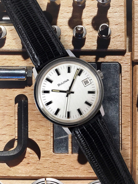 Movement: Bulova cal. 11 AOCD manual-winding movement (17 jewels) with center sweeping seconds; quick-set date display at 3 o'clock; 21,600 BPH; Swiss Made