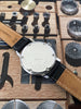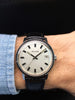 Features: Stunning original brushed metallic silver dial with beveled/polished silver and black hour markers; unique quick-set date functionality by repeated pulling and pushing of the crown; original luminous hands with black inlay; original center sweeping-seconds hand; 35mm stainless steel case with screw-down back and domed acrylic crystal