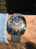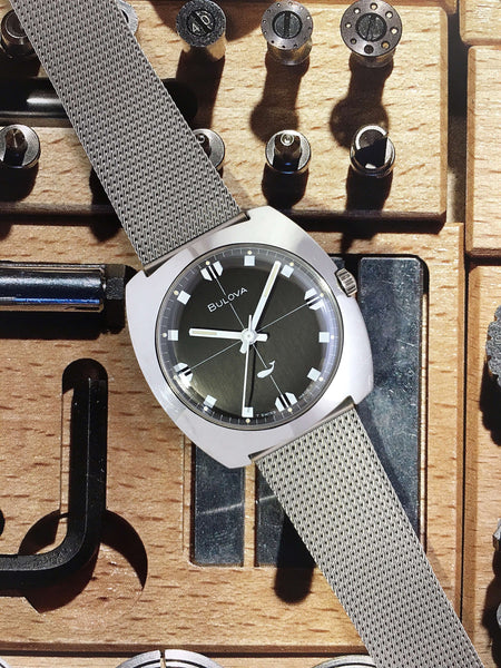Other: This rare 1970 Bulova Sea King model represents tremendous value with a price tag under $500. The vertically-brushed metallic grey "crosshair" dial is super unique with vibrant white printing, cool hour markers, and Bulova's desirable "whale" logo from that era. The solid stainless steel case sits comfortably on the wrist and the mesh bracelet completes a retro 1970s vibe - This is a combo that you won't see on anyone else!