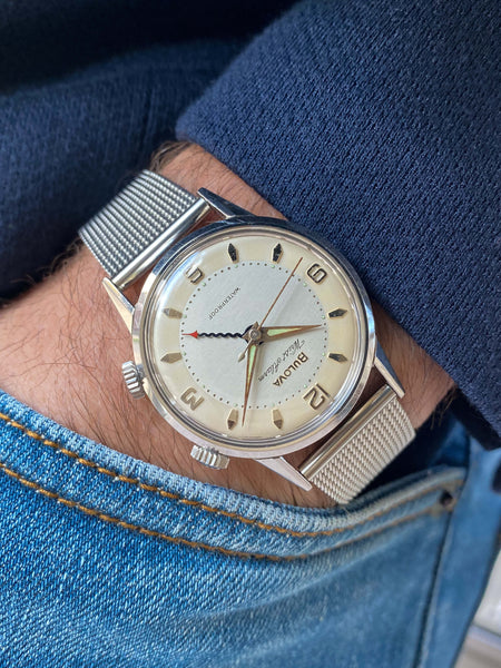 Other: If you're anything like us, you fantasize about the good old days when a classic wrist alarm watch would remind you of daily tasks or even wake you up in the morning. While LeCoultre and Vulcain get all the praise, Bulova Wrist Alarm models fly quietly under the radar (no pun intended). Sometimes we actually prefer a great Bulova Wrist Alarm like this collector-grade example from 1962 - Just look at the cool squiggly alarm hand! This particular watch comes from the earliest batch of 11285 Wrist Alarm models (M2 date code). These rare early examples feature a "WATERPROOF" dial with "SWISS" at the bottom and no "T" markings for Tritium. We love the subtle brushed silver center and beautiful cream-colored outer track. The fine mesh bracelet really completes the 1960s vibe. This is one of the best overall examples of a Bulova Wrist Alarm that we've had the privilege of offering. As an added bonus, the in-house alarm movement has just been completely overhauled by our watchmaker with a NOS factory Bulova mainspring, crystal, and caseback gasket installed at the time of service. A simple turn of the bottom crown sets the alarm hand, while pulling out the crown engages the alarm to sound at that time.