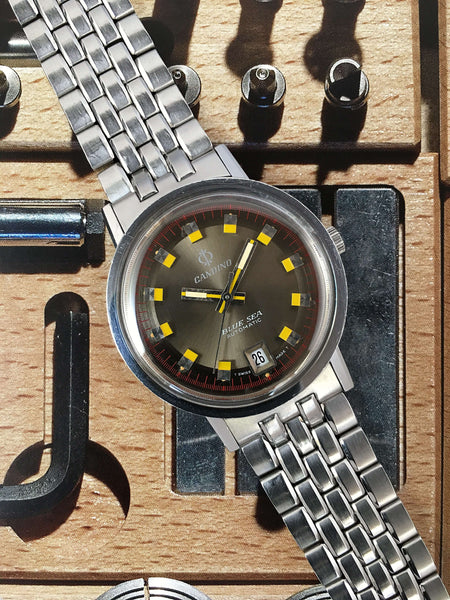 Other: This rare 1960s Candino Blue Sea Automatic isn't your typical vintage diver watch - For starters, check out the crazy exotic dial with unique raised hour blocks and red outer track. The brushed metallic finish shimmers out in the sun where it belongs. We love the matching hands and symmetrical date window placement at 6 o'clock. The sturdy 35mm stainless steel case wears incredibly well on the wrist with its original signed bracelet. It's hard to imagine a more interesting vintage stainless steel sport watch in this type of original condition for well under a grand.
