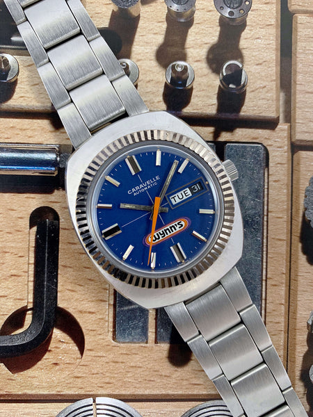 Other: With over 80 years of automotive history dating back to 1939, Wynn's USA still offers a vast array of products designed specifically to maximize vehicle performance. The Wynn's Racing team ran in the IMSA WeatherTech SportsCar Championship Series in 2019 and you'll recognize their colorful logo on the cars. This cool 1971 Caravelle Day-Date automatic watch features the same Wynn's logo on its vibrant matte blue dial. The whole watch screams 1970s from the cushion case with shiny "fluted" bezel and domed acylic crystal to the bright orange sweeping-seconds hand. The rare 20mm Caravelle "Oyster" style bracelet completes an overall sporty look that could also be dressed up.