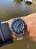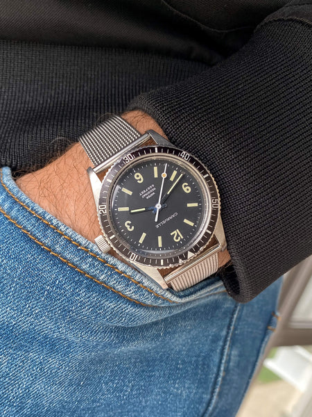 Features: Stunning original matte black 3-6-9-12 dial with silver print and yellow Tritium hour markers; desirable white "lollipop" sweeping-seconds hand; original rotating diver bezel displays elapsed time; unpolished solid stainless steel case with great proportions and factory NOS acrylic crystal; retro Milanese mesh bracelet
