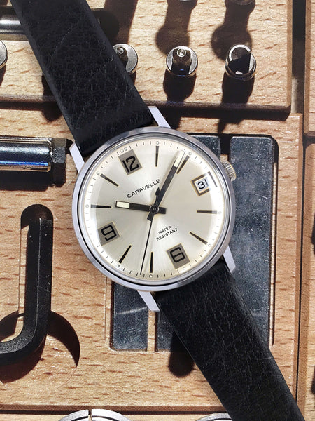 Other: This cool vintage Caravelle watch is a great buy for under $200! It features a unique and interesting dial with funky 1970s numerals and a date window at 3 o'clock. It is powered by a manual-winding movement and comes in a nice size case with a domed acrylic crystal. It looks awesome on the NOS Caravelle black leather strap.