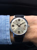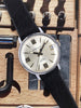 Features: Stunning original silver sunburst dial with funky numerals at 6, 9, and 12 o'clock; date display at 3 o'clock; perfect original lume plots; original handset; 35mm case with domed acrylic crystal; manual-winding movement; NOS Caravelle strap