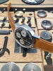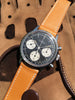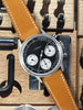 Features: Stunning original reverse panda dial (matte black with white sub-registers); tachymeter scale for calculating the average speed of a moving object over time (i.e. during racing applications); original Tritium hands with gorgeous yellow patina; original black sub-register hands and large white chronograph sweeping-seconds hand; manual-winding Valjoux movement with 12-hour chronograph recording capability; sharp 36mm stainless steel case with original oversized winding crown; domed acrylic crystal