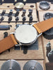 Strap: 19mm handmade smooth tan calfskin strap with contrast stitching and polished stainless steel tang buckle