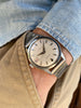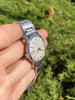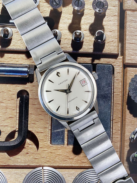Other: Croton has become a household name within collector circles and rightfully so - They made some really cool watches and this affordable Aquamatic Date with gorgeous white dial is no exception. We love the unique art-deco numerals at 6 and 12 o'clock and the pop of red color from the date disc. The rare vintage Speidel bracelet makes the watch wear larger than its stated size. The overall minimal design aesthetic is extremely versatile, allowing the watch to be dressed up or down. As an added bonus, our watchmaker just completely overhauled the Swiss ETA 2472 automatic movement.