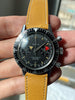 Features: Stunning original matte black dial with beveled shiny black sub-register rings and gorgeous yellow Tritium hour markers; outer tachymetre scale for calculating the average speed of a moving object over time (i.e. for racing applications); 30-minute chronograph recording capability and red 5-minute yachting regatta countdown; cool original broad-arrow hour hand; original "alpha" sub-register hands; original rotating bezel displays elapsed time (i.e. during dives) and can track a second time zone; large unpolished 38mm stainless steel case with domed acrylic crystal; high-grade Valjoux 23 column-wheel chronograph movement; very desirable Chronomaster model