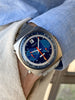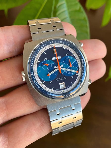 Features: Stunning original exotic blue dial with unique "big-eye" yachting regatta register and date display at 6 o'clock; Buren cal. 15 automatic chronograph movement with 30-minute recording capability; unique running seconds register at 10 o'clock; cool original handset with neon orange accents; unpolished 40mm stainless steel case with original domed acrylic crystal; rare original bracelet