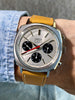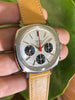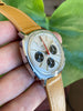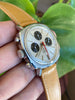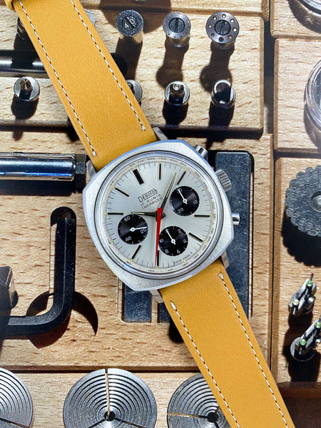 Other: If you're looking for a vintage chronograph watch reminiscent of iconic Heuer designs without spending a fortune, this extremely rare Desotos chronograph is a solid value play at about 1/3 of the price of a comparable Heuer. In fact, the case is essentially identical to the Heuer Camaro that we all know. It utilizes the same high-grade Valjoux 72 movement that Heuer used in most of their manual-wound, three-register chronographs. And it's hard to beat the desirable "panda" dial with contrasting black sub-registers and inner tachymeter scale for racing. The silver sunburst dial really comes to life in the sun, as does the desirable golden yellow patina to the luminous elements. Just like the original Heuer Camaro, this case wears incredibly well on the wrist with fantastic proportions clocking in at about 37mm in diameter. Speaking of the case, it is completely unpolished and razor sharp! Once these cases are polished, it's all over... You definitely don't want to lose the sharp edges and defined sunburst finish on the top of the case. This collector-grade example comes mounted on a comfortable 19mm handmade tan calfskin strap.