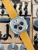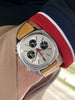 Features: Stunning original "panda" dial (silver sunburst with contrasting black sub-registers); unique tension ring crystal with inner tachymeter scale for calculating the average speed of a moving object over time (i.e. racing applications); original hands with matching yellow patina; legendary Valjoux 72 movement with 12-hour chronograph recording capability and smooth column-wheel activation; unpolished 37mm stainless steel case with original winding crown