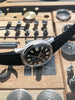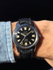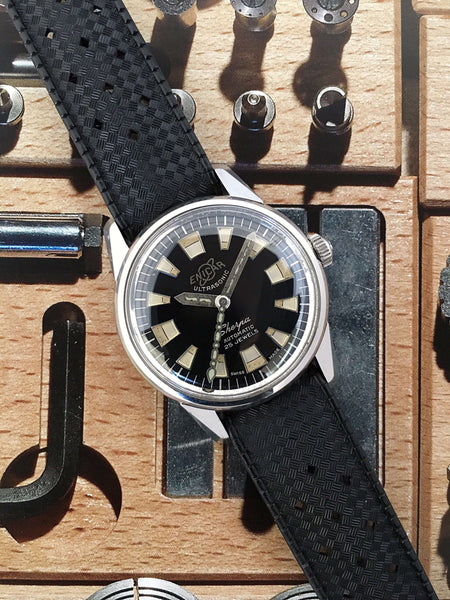 Features: Stunning original glossy black gilt dial with applied Enicar "Saturn" logo and oversized luminous hour markers; super cool original luminous handset; 34mm solid stainless steel case with original high domed acrylic crystal; 18mm Swiss Tropic strap with signed Enicar buckle; rare transitional model