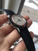 Features: Stunning original "eggshell" dial with applied Enicar "Saturn" logo and beveled/polished hour markers; original handset; date display at 3 o'clock; original black rotating bezel with silver print and green accents displays current time in major world cities; 36mm solid stainless steel case with original domed acrylic crystal; original 19mm Swiss Tropic strap and signed Enicar buckle; extremely rare first-generation model in NOS condition