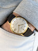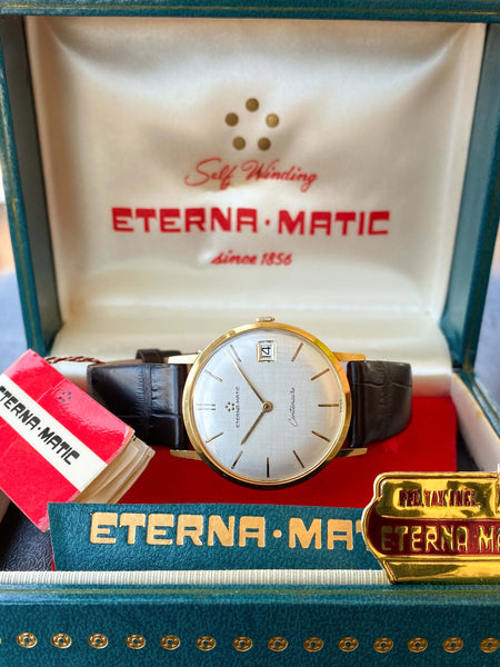 Other: This rare Eterna-Matic Centenaire is channeling some serious Mad Men vibes (think of Roger Sterling early on in the series). The beautiful original Swiss-only dial with linen finish glistens out in the sun and comes fitted in an unpolished solid 18K yellow gold case with ultra-slim profile that is sure to slide under any cuff. We equally recommend dressing it down with some jeans though. The original winding crown is signed and the low-domed acrylic crystal matches the sleek case perfectly. With a solid 18K gold case and in-house movement with quick-set date, this is a luxury watch that was ahead of its time and perfect for the astute collector. Oh, and it also comes with its original box and hang-tag booklet - $210.00 was a lot of money for a watch back in 1962!