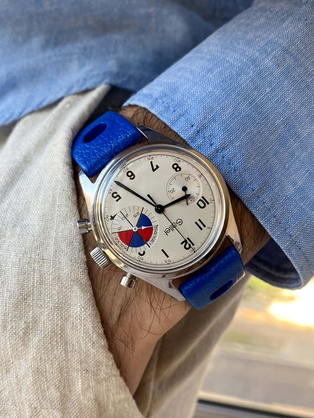 We strongly believe that the Gallet designed the most attractive vintage regatta watches that money can buy, and this superb example comes available for sale from Justin's personal collection. It was sourced years ago from the daughter of the original owner (who was an avid sailor). Simply put, it's hard to beat the unique colorful regatta sub-register and overall design execution. The 36mm steel case wears so well on the wrist, and the matching blue Swiss Tropic strap can bring you all the summer vibes even when it's cold outside. If you collect these or are trying to track one down, you already know how difficult they are to find in this condition.