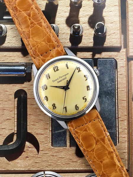 Features: Stunning original "tropical" dial with unique patina and cool applied "Banco" numerals; original luminous blued-steel hands; original matching blued-steel center sweeping-seconds hand; solid stainless steel case with screw-down back and great proportions; domed acrylic crystal; rare GP Sea Hawk model variation