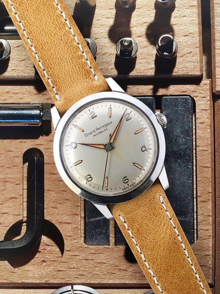 Other: This rare 1950s manual-winding GP is absolutely gorgeous with its creamy "eggshell" dial and vibrant yellow lume. We love the unique hour markers! The 35mm stainless steel screw-back case slides nicely under a cuff and sits comfortably on the wrist. If you're looking for a versatile and interesting conversation piece with a workhorse manual-winding movement, this is it! Once this one is gone, you won't find another one exactly like it...