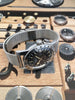 Features: Stunning original matte black 24-hour dial with luminous hour plots and date display at 3 o'clock; original luminous hands rotate once every 24-hours to distinguish AM and PM; original center sweeping-seconds hand with small "lollipop" and legible white tip; original rotating stainless steel bezel with locking capability tracks a second time zone and AM/PM simultaneously; automatic movement with unique hacking-seconds function; solid steel case with great proportions; original domed acrylic crystal with internal date magnifier; retro mesh bracelet