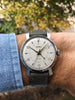 Features: Stunning original white dial with art-deco numerals and luminous "torch" indices; original luminous hands; original black arrow alarm indicator hand and center sweeping-seconds hand; unique and early Swiss mechanical alarm movement with two separate barrels for the watch and alarm (controlled entirely by a single crown); alarm indicator aperture at 12 o'clock displays red when alarm is engaged and white when alarm is disengaged; 35mm solid stainless steel case with cool lugs and original domed acrylic crystal