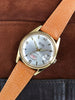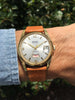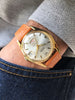 Features: Stunning original silver sunburst dial with gold-tone markers and cool "6-9-12" Arabic numerals; day aperture at 6 o'clock with red text; date display at 3 o'clock with black numbers; original gold-tone handset; unpolished case with desirable patina developing on the gold plating; original domed acrylic crystal with internal date magnifier