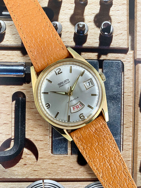 Other: This rare 1960s Gruen Precision Day-Date is absolutely incredible in the metal. With its shimmering silver sunburst dial and unique day aperture with red text, it is a fantastic example of 1960s design and sure to be a conversation piece. The sharp case is unpolished and has developed some desirable patina to the gold plating. It is all original down to the crystal and in collector-grade condition - What more can you ask for at this price point? Oh, and you won't run into anyone else wearing the same watch (even at your local RedBar G2G). In fact, we seriously doubt you'll ever find a better example than the one we are offering for sale here.