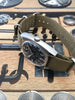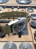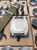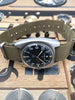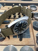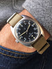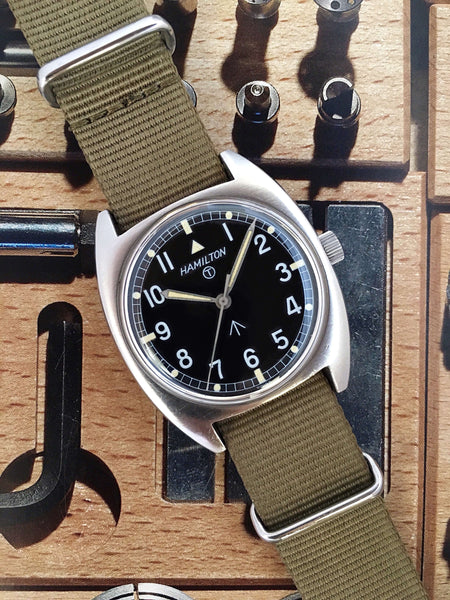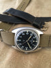 Strap(s): 19mm OD-green nylon NATO strap with stainless steel hardware designed for use with fixed spring bars; also includes rare original black leather strap with standard tang buckle and "Broad Arrow" issue markings