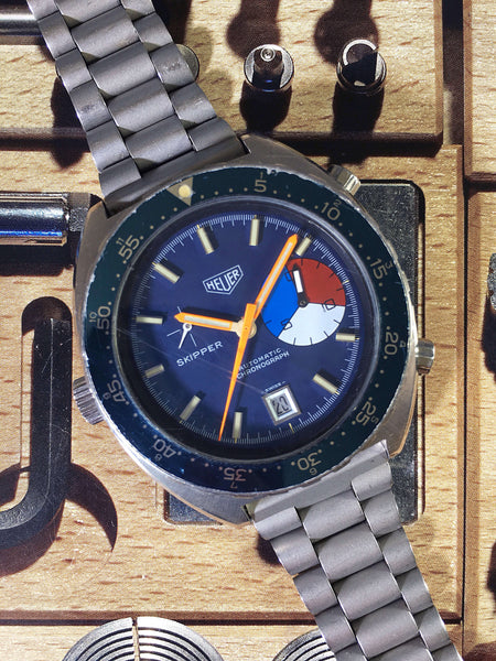 Other: Vintage Heuer is as hot as it has ever been and we all know how difficult it is to find honest, original examples of rare executions such as this 15640 Skipper. If you haven't been out yachting recently, we'll break it down for you: The red, white, and blue register segments each represent 5-minute intervals within a 15-minute regatta countdown. In the 15 minutes leading up to a race, yachts are jockeying for position behind a starting buoy - The tri-color coding makes the chronograph easy for skippers to read at a glance, letting them know when they are permitted to cross the starting line. Given the relative obscurity of the sport, tool watches designed specifically for this purpose are all the more rare and desirable. If you're looking for the perfect watch for the upcoming spring and summer months, this colorful Heuer Skipper is it (whether or not you'll be spending any time on a yacht).