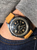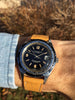 Condition: Fantastic original condition overall with minor honest wear consistent with age and use; sharp solid stainless steel "straight-lug" case appears to be completely unpolished; crisp screw-down caseback remains clearly legible with the original brushed finish in the center and a few minor toolmarks; original independent rotating bezels are both in very good condition overall; gorgeous original glossy black dial exhibits vibrant yellow patina to the Tritium luminous elements and some minor wear on the very outer edge between 1 and 3 o'clock; original Tritium hands with matching yellow patina; clean original domed acrylic crystal with internal date magnifier