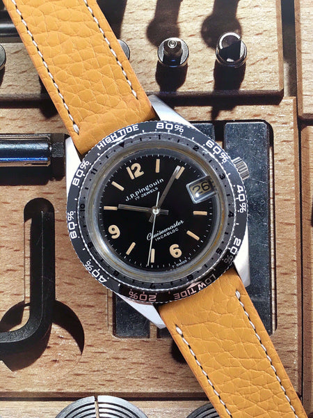 Other: As purveyors of rare and unique vintage watches, we dream about finding "unicorn" watches. Although that term is thrown around quite loosely in our experience, this ridiculously cool J.P. Pingouin Cruisemaster truly is a rare bird. In fact, we have only uncovered three total examples of the Cruisemaster with this being the only example signed by J.P. Pingouin on the dial (a notable Swiss watch manufacturer of the 1960s and '70s). The other two known Cruisemaster tidal watches were manufactured by J.P. Pingouin for private-label companies. If you're not already familiar with the name, J.P. Pingouin manufactured the bulk of their watches for LeJour and many other lesser-known brands (Kaltron, Thomax, and Welsbro to name a few) - It is quite rare to see their own name on the dial of any watch, let alone on something this awesome. Specially designed for use in high-risk tidal zones, the wearer could easily track the daily tide percentages by simply rotating the outer bezel to line up "HIGH TIDE" with the estimated local time of high tide for that day. The hour hand will then indicate the corresponding tide percentages as time goes on throughout the day. J.P. Pingouin took this initial design one step further by incorporating a second independent rotating bezel. With this secondary inner bezel, the wearer could track the tides in a second time zone simultaneously (very useful if sailing across multiple time zones). As far as tool watches go, it doesn't get much cooler (and rarer) than this.