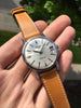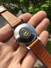 Strap: 18mm handmade smooth tan calfskin strap with contrast stitching and polished stainless steel tang buckle