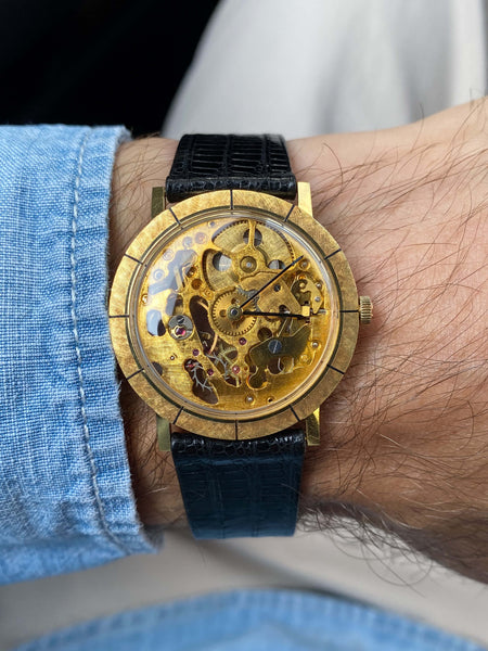 Features: Stunning original openworked skeletonized movement with "Florentine" finishing; original black painted hands; 33mm solid 18K gold case manufactured by Gabus Frères of Le Locle, Switzerland (141 hallmark case code); razor-sharp "Florentine" bezel with 12 black inlaid hour markings; acrylic exhibition caseback reveals beautiful Lucien Piccard Supreme manual-winding movement; original domed acrylic crystal; great vintage strap; also includes original Lucien Piccard strap and buckle