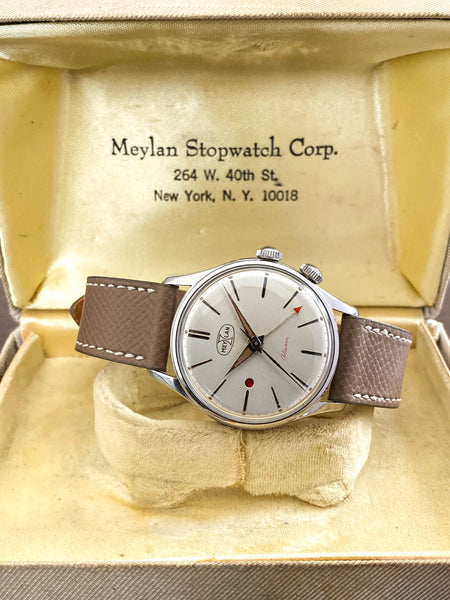 Other: It's no secret that we love vintage mechanical alarm watches and this 1960s Meylan Alarm reference 685 is no exception! This particular example was manufactured in the early 1960s and fitted with a Venus 230 movement, which is controlled by two crowns and features an open aperture in the dial at 9 o'clock to indicate whether the alarm is turned on or off. When the dot is red, the alarm is disengaged (turned off). When the crown at 4 o'clock is pulled out, the dot turns to show lume and the alarm is engaged (on). This watch is as unique as it is cool and it represents an advance in mechanical alarm technology. The svelte 34mm stainless steel case wears incredibly well on the wrist and gives off a stylish Mad Men vibe. For those of us that are tired of seeing the same watches over and over again, we guarantee that you won't run into anyone else wearing this watch. And it goes without saying that we are extremely proud to offer such a rare watch in fine condition with its original box...