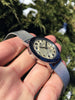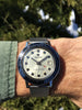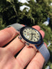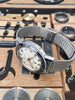 Case: Solid stainless steel case with two-piece screw-down back is approximately 36mm across the bezel excluding the dual original unsigned winding crowns