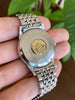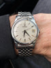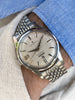Features: Stunning original creamy white "crosshair" dial with applied Omega logo and non-luminous hour markers; original non-luminous handset; date display at 3 o'clock; sharp 35mm stainless steel case with original Omega signed domed acrylic crystal; screw-down caseback with gold Constellation medallion; matching Omega No. 12 "beads of rice" bracelet; in-house Omega Chronometer movement (serviced)