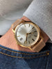 Condition: Mint original condition overall with only minor signs of wear consistent with age and very light use; razor-sharp case is completely unpolished; crisp presentation caseback is clearly legible with the brushed finish in tact; incredible original silver sunburst dial with all lume plots in tact and aged to a pleasing yellow hue; excellent original gold-tone handset with all luminous material in tact and matching; nice original signed Omega acrylic crystal