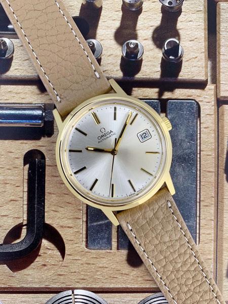 Features: Stunning original silver sunburst dial with all lume plots in tact and aged to a beautiful yellow hue; gold-tone hour markers with black inserts; quick-set date display at 3 o'clock; original matching gold-tone handset; 20 microns yellow gold-plated case with great presentation caseback; original signed Omega acrylic crystal; Omega self-winding automatic movement with hacking seconds; handmade strap