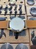 Strap: 18mm handmade textured taupe calfskin strap with white stitching and 16mm yellow gold-plated tang buckle