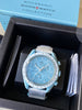 Features: Stunning original pale blue dial with matching sub-registers and white hands; pale blue 42mm proprietary Bioceramic case with white Tachymetre bezel and signed plastic crystal; original 20mm white MoonSwatch VELCRO strap