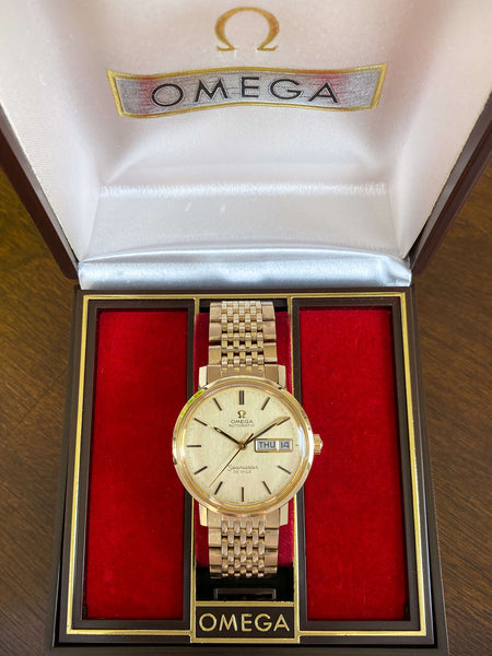 Features: Stunning original brushed champagne dial with applied Omega logo and stick hour markers with black overlay; original yellow gold-tone handset with black and luminous inserts; day-date display at 3 o'clock with traditional quick-set date and unique quick-set day (set hands in reverse to quick-set the day of the week); original signed Omega domed acrylic crystal; unpolished solid 14K gold case with presentation back; beautiful original Omega BOR bracelet; in-house Omega movement (serviced); includes original box