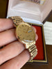 Other: Looking for a relatively affordable solid gold vintage watch from a powerhouse brand? Consider this gorgeous Omega Seamaster De Ville! It's a great size at 35mm excluding the crown and slides comfortably under the cuff of a shirt or jacket. The yellow gold case, brushed champagne dial, and gold-tone bracelet give you a killer gold-on-gold-on-gold look. This particular example is in nearly unworn condition with only light wear from storage and handling. It also comes with its original box and a bit of history! The caseback confirms that it was awarded to Clarence O. Walters on June 30, 1978 for his 25 years of loyal service to Scholl, Inc. It was common back in that era to receive a solid gold watch after reaching the quarter century milestone. Nowadays one probably receives a cheap gift card... As an added bonus, the in-house Omega 1020 automatic movement has just been completely overhauled by our watchmaker. It beats at 28,800 BPH with hacking seconds and features a traditional quick-date that can be set in either direction and a unique quick-set day of the week. You actually slowly set the hands in reverse to change the day of the week, which makes everything really easy to set.
